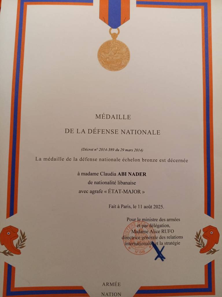 العالمية / ميدالية وزارة الدفاع الفرنسية للأديبة الدكتورة كلوديا شمعون أبي نادر
