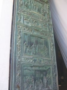 يَحتوي الباب الرئيسي على لوحات تَحكي حياة السيدة العذراء مريم، والبابان الآخران يحتويان على لوحات تَحكي حياة يسوع المخلّص، ويتألّفان من 24 لوحة فنيّة ضخمة.